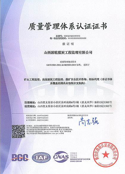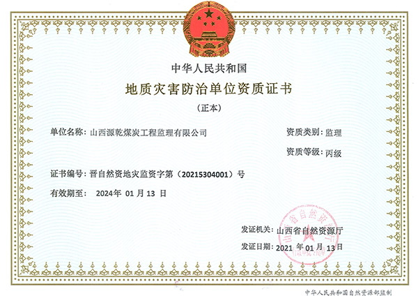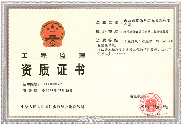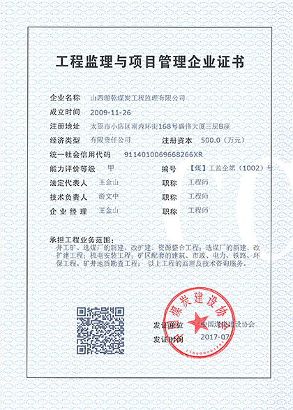 ? ? ? ? 山西源乾煤炭工程監(jiān)理有限公司成立于2009年11月,具有住房和城鄉(xiāng)建設部礦山工程監(jiān)理甲級、房屋建筑工程監(jiān)理甲級、市政公用工程監(jiān)理乙級、電力工程監(jiān)理乙級;具有中國煤炭建設行業(yè)礦山工程、建筑工程、機電安裝工程、市政工程、電力工程、鐵路工程、環(huán)保工程以及地質(zhì)勘探工程監(jiān)理甲級資質(zhì);同時具有環(huán)境工程監(jiān)理資質(zhì)、地質(zhì)災害治理監(jiān)理丙級資質(zhì)。公司為中國煤炭建設協(xié)會會員單位、山西省建設監(jiān)理協(xié)會理事單位、太原市建設監(jiān)理協(xié)會會員單位、山西省煤礦建設協(xié)會會員單位。